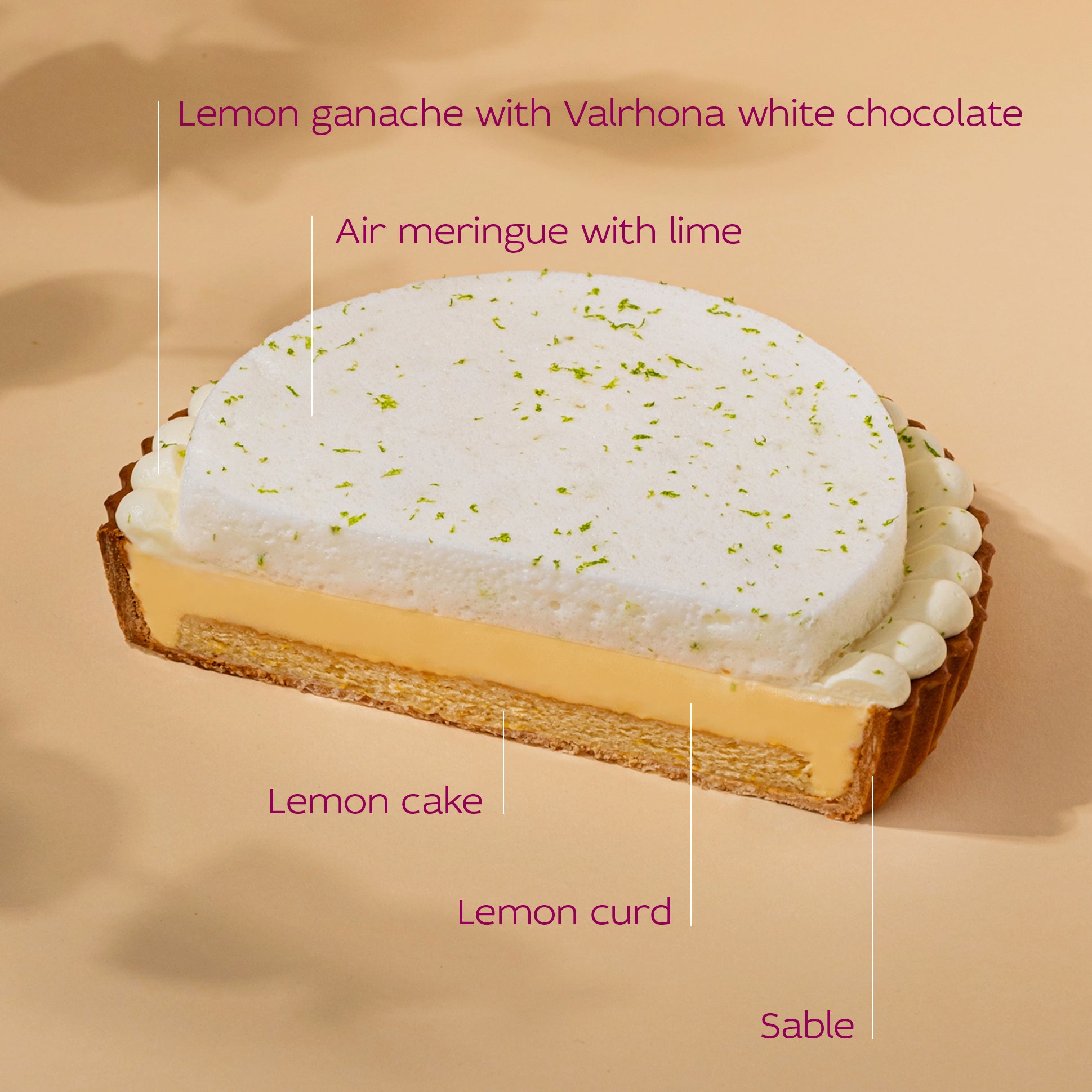 Пътешествието започва с хрупкава бадемова сабле основа – маслена база, която носи удовлетворяващ ядков завършек. Върху нея лежи сочен лимонов кейк, напоен с кора от пресни цитруси, за да гарантира, че всяка хапка е плътна и ароматна. Добавихме слой кадифен лимонов кърд – наситен, цитрусов крем, който е едновременно богат и приятно киселинен.