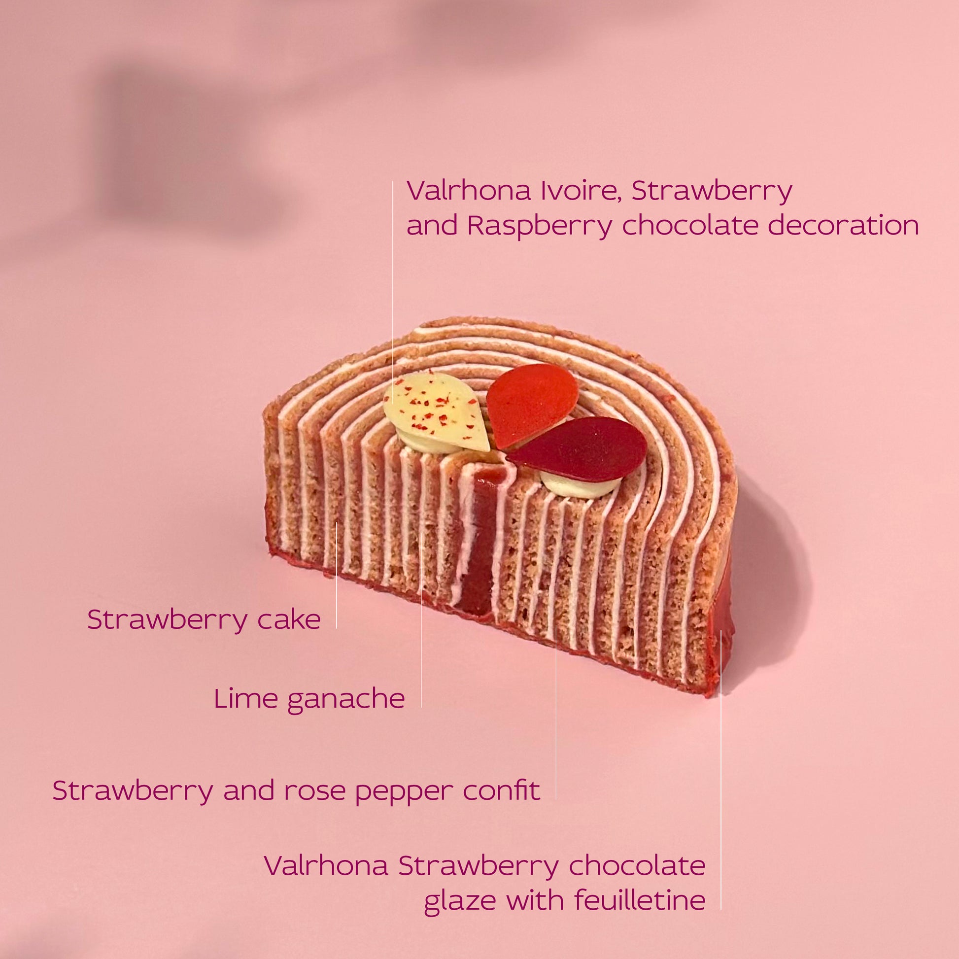 Всичко в нея е въпрос на текстура и характер. Започваме с пухкав ягодов кейк, който крие в себе си нашето авторско сладко от ягоди, „събудено“ с фин заряд от розов пипер. Тук магията се случва, докато дегустирате – пиперът не носи лютивина, а по-скоро отваря аромата на плода и го прави по-дълбок и вълнуващ. За да олекотим всяка хапка, добавихме ефирен лайм ганаш, чиято цитрусова свежест действа като перфектен контраст на плодовата сладост.