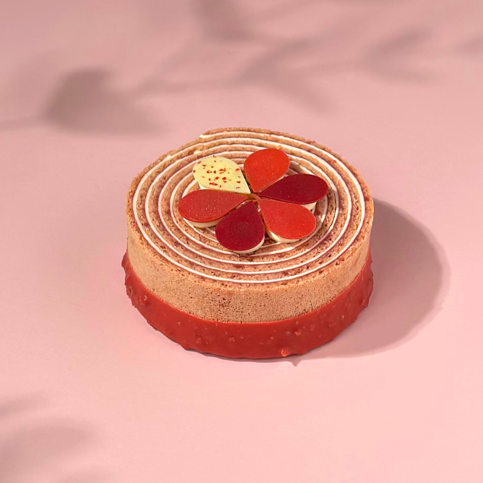 Задължителният за нас хрупкав елемент идва от основата с вафлени корички (фюлетин) и ягодов шоколад Valrhona, а финалът е прецизно изработена декорация от три вида шоколад, която завършва това малко бижу. Резултатът е десерт, който е едновременно ефирен, модерен и напълно различен – новата ни авторска торта, създадена да вълнува.