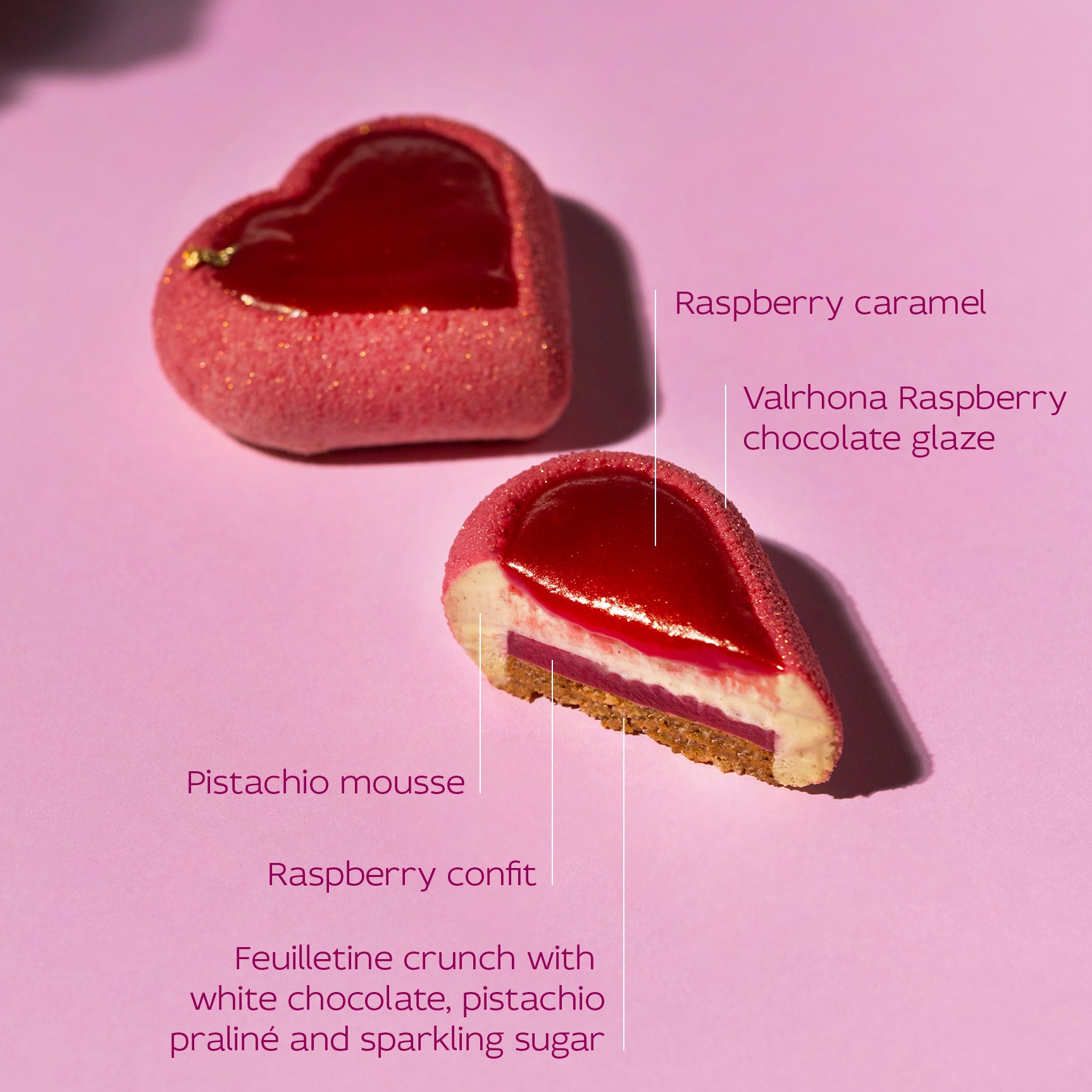 За Нея: Свежата и елегантна комбинация от малина и шамфъстък. Нежно плодово конфи среща плътното пралинé върху хрупкава основа с пукаща захар, която добавя искри към всяка хапка.