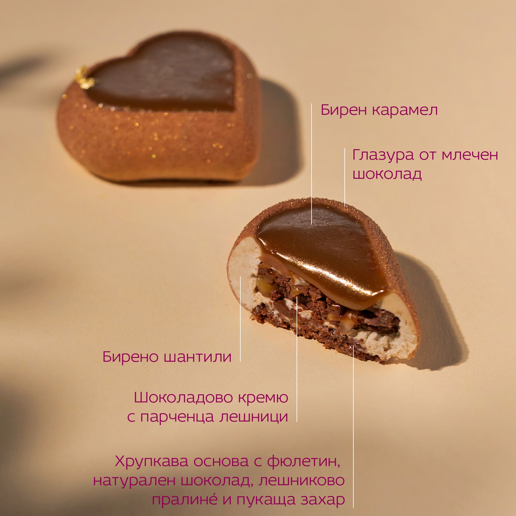 Любовта има много лица, а нашето празнично дуо е тук, за да отпразнува всеки нюанс на близостта. Създадохме два индивидуални десерта, които носят същата прецизност и дух като голямата ни торта, но са поднесени като личен жест.