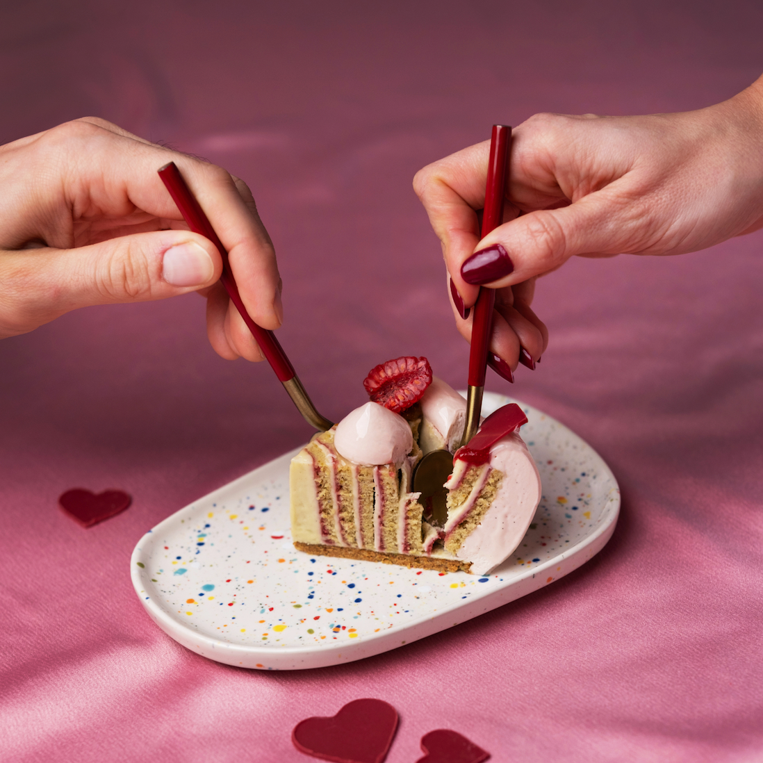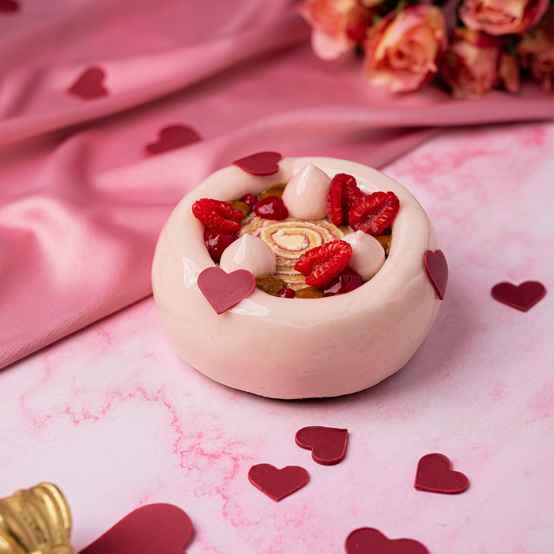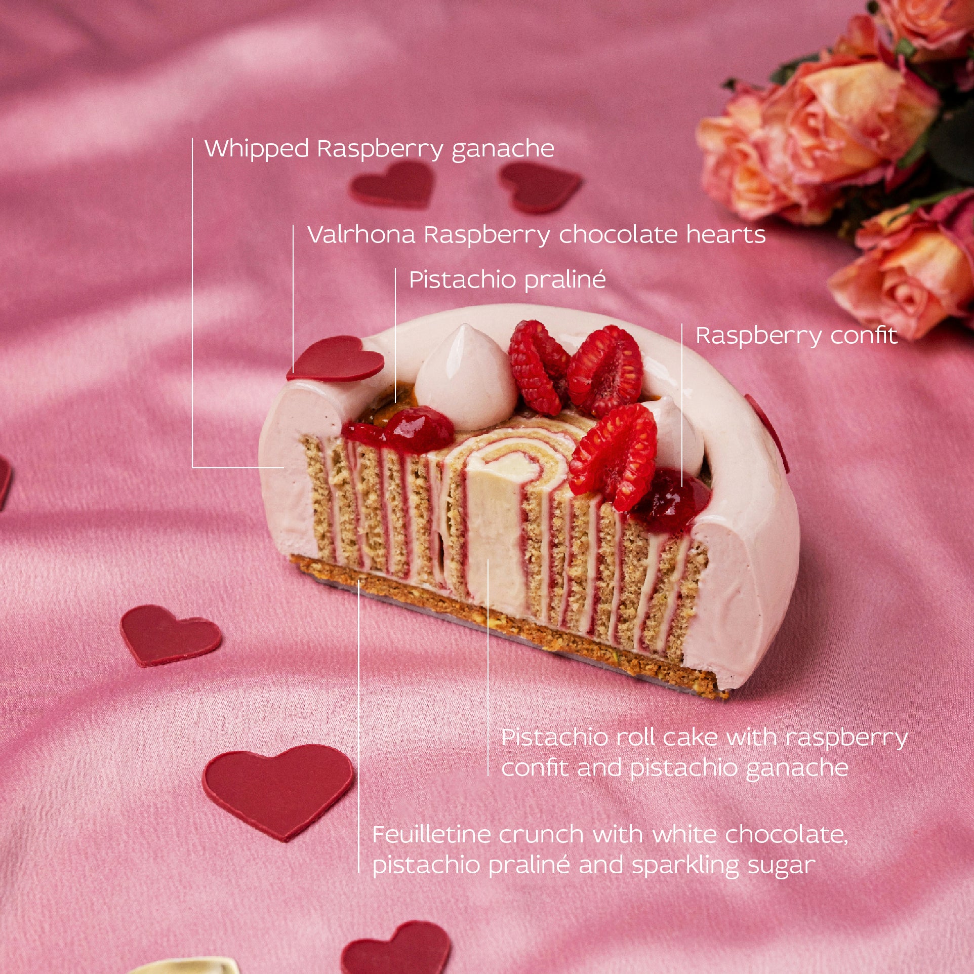 В основата на това преживяване стои уникално вертикално руло от шамфъстък блат, малиново конфи и нежен шамфъстъчен ганаш, което придава на всяка хапка неповторим характер. Обгърната в ефирен избит малинов ганаш и декорирана със сърца от малинов шоколад Valrhona, тортата е едновременно нежна и дръзка.